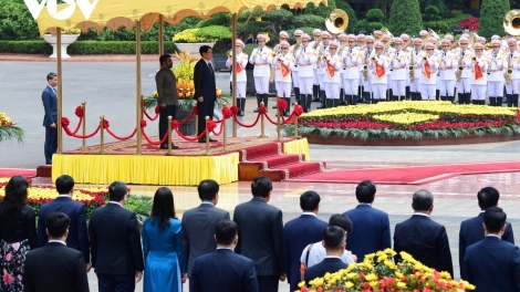 (VOVWORLD) - Утром 5 мая в Президентском дворце в Ханое президент Вьетнама Лыонг Кыонг возглавил церемонию приветствия президента Шри-Ланки Ануры Кумары Диссанаяке, прибывшего с государственным визитом во Вьетнам и для участия в праздновании Международного дня Весак с 4 по 6 мая.