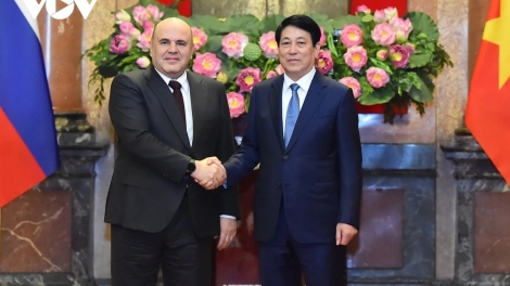 (VOVWORLD) - 15 января в Президентском дворце президент Лыонг Кыонг принял премьер-министра России Михаила Мишустина и делегацию российского правительства, которые с 14 по 15 января находятся с официальным визитом во Вьетнаме.