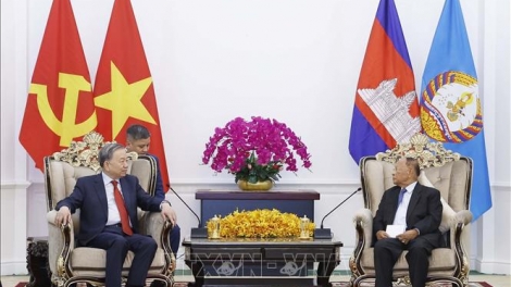 (VOVWORLD) - В рамках государственного визита в Королевство Камбоджа, утром 6 февраля в Пномпене Генеральный секретарь ЦК КПВ То Лам встретился с Самдеком Течо Хун Сеном.