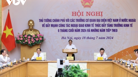 (VOVWORLD) - 18 июля во второй половине дня Премьер-министр Фам Минь Тинь председательствовал на конференции Премьер-министра с главами представительств Вьетнама за рубежом по вопросам продвижения экономической дипломатии для содействия экономическому росту в последние 6 месяцев 2024 г. и в последующие годы. Конференция состоялась в гибридном формате с участием представителей глав представительств Вьетнама за рубежом и народных комитетов провинций и городов центрального подчинения.