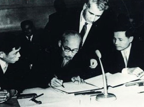 | Президент Демократической Республики Вьетнам Хо Ши Мин подписывает совместное заявление Международного совещания представителей коммунистических и рабочих партий (Москва, 1957). Архивное фото |