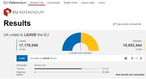 По опубликованным утром 24 июня официальным результатам референдума, за выход страны из ЕС проголосовали 51,9% британцев. За то, чтобы остаться – 48,1%. Таким образом, британские избиратели официально проголосовали за выход страны из ЕС. Лидер Партии независимости Соединённого Королевства Найджел Фараж, заявил, что стороники Brexit одержали победу, и 24 июня вошло в историю Великобритании как «день независимости».