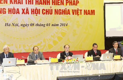 Конституция, которая была приняла Национальным собранием Вьетнама 13-го созыва 28 ноября 2013 года, вступила в силу 1 января 2014 года. Для исполнения Конституции потребуются: повышение осознания населением, кадрами, гослужащими и проживающими за границей вьетнамцами ответственности за защиту Конституции, точное определение ответственности учреждений и организаций в исполнении Конституции, а также обеспечение исполнения Конституции во всех сферах и создание движущей силы для всестороннего проведения дела обновления страны.
