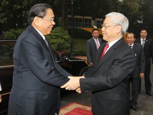 (VOVworld) - С 26 по 28 декабря по приглашению генерального секретаря Центрального комитета Коммунистической Партии Вьетнама Нгуен Фу Чонга в нашей стране с официальным дружественным визитом находится генеральный секретарь Центрального комитета Народно-Революционной Партии Лаоса (НРПЛ), президент Лаоской Народно-Демократической Республики (ЛНДР) Тюммали Сайнясон с супругой. Состоявшийся в последние дни Года вьетнамо-лаоской дружбы 2012, данный визит является важным событием, способствующим укреплению и развитию отношений традиционной дружбы, особой солидарности и всестороннего сотрудничества между Вьетнамом и Лаосом.