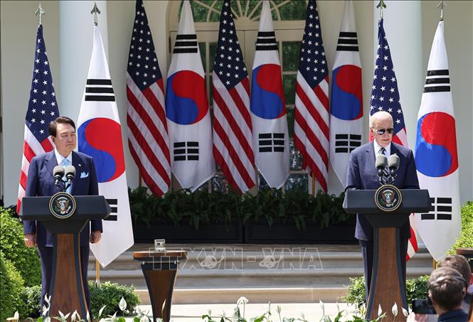 Cовместная пресс-конференция по итогам встречи на высшем уровне РК-США. Фото: YONHAP/VNA |