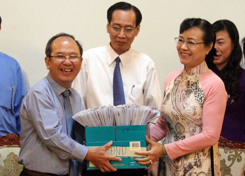 | Председатель Избирательной комиссии города Хошимина передает документы представителю Комитета Отечественного фронта города Хошимина. Фото: Trung Sоn |