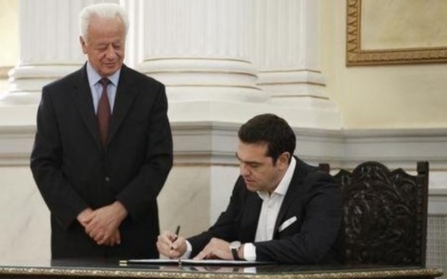 | Премьер-министр Греции Алексис Ципрас подписывает протокол после инаугурации. Фото: Reuters |