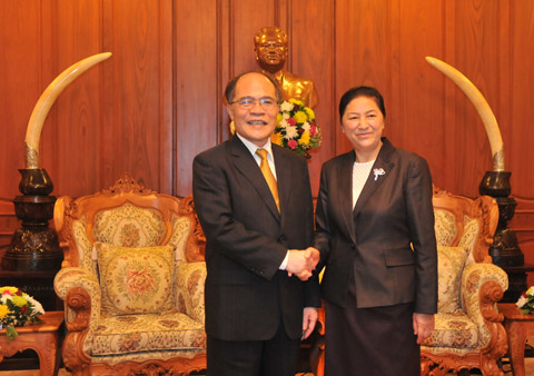 | Председатель Верховного народного собрания Лаоса Пани Ятхоту принимает спикера вьетнаммкого парламента Нгуен Шинь Хунга. Фото: Lam Hien |