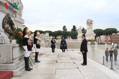 | Президент Вьетнама Чан Дай Куанг возглагает венок к монументу Витториано - Алтарю отечества на Венецианской площади в ходе визита в Италию. Фото: VOV |