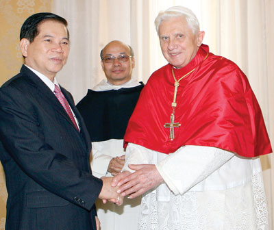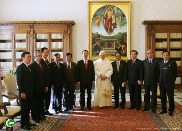 | Премьер-министр Вьетнама Нгуен Тан Зунг встречается с Папой Римским Бенедиктом XVI в 2007 году в Папском престоле Ватикан |