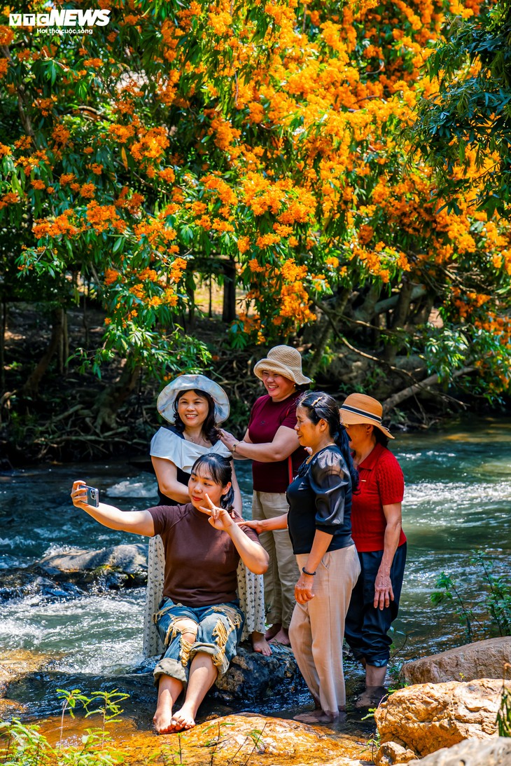 Туристка Чан Ми Линь из провинции Кханьхоа поделилась: «Мы были поражены первозданной красотой этого места — чистый воздух, прохладная вода, а яркие цветы, отражающиеся в ручье, способны снять всю усталость». |