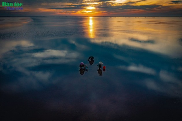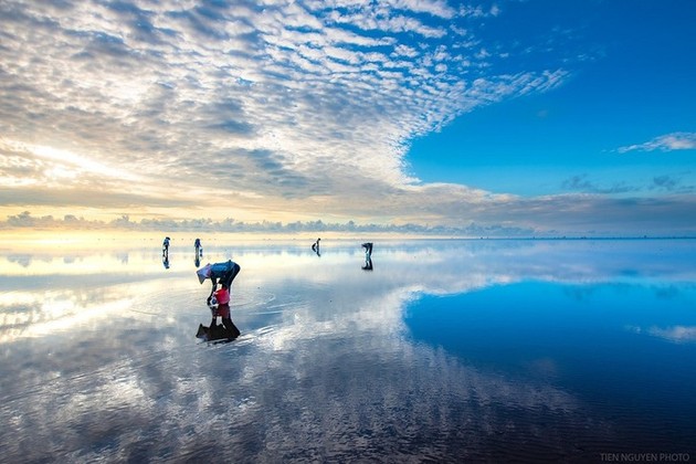 Обширный участок пляжа похож на гигантское зеркало, отражающее все, что находится над ним, создает красивый, мерцающий пейзаж (Фото: Тьен Нгуен).
