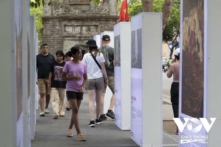 Посетители любуются фотовыставкой под открытым небом, которая проходит на пешеходной улице вокруг озера Хоанкием в центре Ханоя.