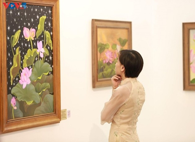 На выставке представлены 75 картин на тему лотоса художницы Ким Дык, стоимость которых оценивается в 20 миллионов долларов США.