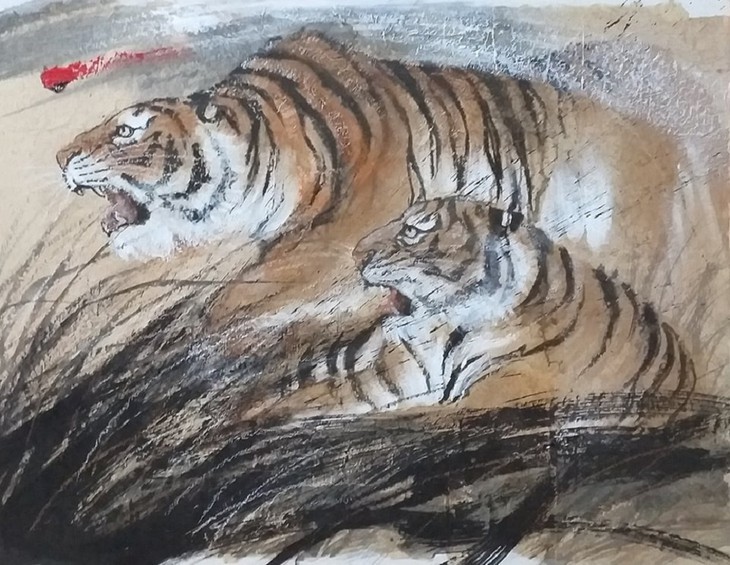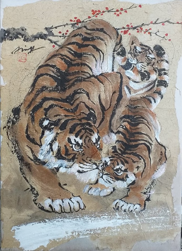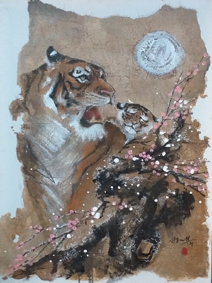 В последние годы зодиакальные животные всегда вдохновляли художника Ниня, особенно с наступлением Тэта. Не так давно он впервые нарисовал тигров. Чем больше он изучает тигров, тем больше ему нравится их рисовать. В этом году его «тигровая» коллекция включает 48 картин, что соответствует его возрасту. Нинь рисует тигров как величественных владык джунглей, а иногда и как сердечных воспитателей.