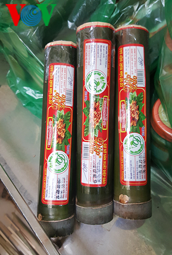 Чем плотнее засунуто мясо в трубки, тем оно получается вкуснее. После мяса в трубки поверх него нужно положить листья гуавы, а потом наглухо закрыть трубки. Кислое мясо в трубках может сохранять свой вкус и аромат на протяжении 2-3 месяцев. Вкусная кислая свинина должна имеет приятный аромат, а также сохранять цвет свежего мяса и жёлтый цвет кукурузной муки. Динь Ван Тхан из общины Вомиеу далее сказал: «Сначала необходимо облить мясо водой с температурой в 45 градусов, а потом вытереть его насухо. Затем готовят смесь из чеснока, лука и муки для маринования мяса. Свинину нужно нарезать тонкими ломтиками длиной 2-3 см, чтобы маринад проник вглубь мяса».