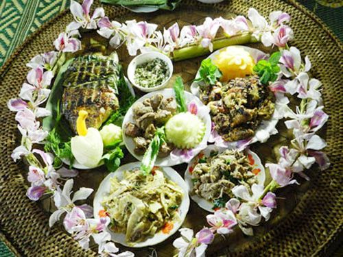 Обычно праздничные блюда раскладываются на корзине, на которую кладутся прогреваемые на огне листья. Каждая корзина накрыта и красиво украшена разными печеными, варёными и пареными блюдами. Наслаждаясь этими праздничными блюдами, туристы и гости издалека почувствуют искренние чувства и гостеприимство представителей народности Мыонг, и больше узнают об их обычаях и традициях. Праздничные блюда, под которые подкладываются листья, считаются квинтэссенцией кухни народности Мыонг, а также являются выражением благодарности к предкам, небу и земле.