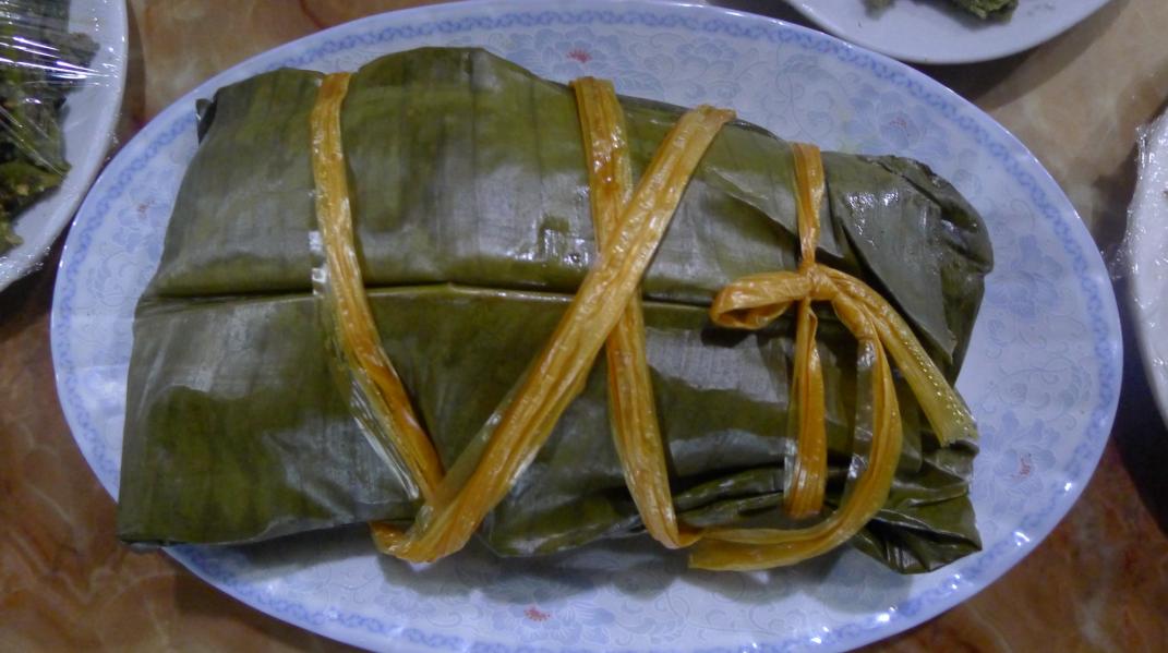 Очень вкусное и интересное блюдо из фарша, приготовленное в листе банана. Свинина является главным мясом на повседневных столах вьетов, однако женщины народности Тхай превращает свинину в своеобразное блюдо, характерное только для этой народности. Обернутую в лист банана свинину тоже готовят на пару целый час, в результате чего мясо приобретает аромат листев банана, впитывает черный перец и приправы, что дает неповторимый вкус.