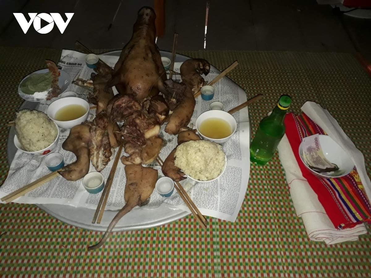 Перед началом обряда шаман проверяет наличие всех необходимых блюд на подносе. Затем он кладет около подноса рубашку хозяина дома и просматривает список имен покойных предков хозяина, занесенных в генеалогическое древо семьи. После этого шаман, читая молитвы, берет еду палочками или ложкой и сует ее через отверстие, специально прорезанное на деревянной стене дома. Он повторяет данное действие много раз, демонстрируя «кормление» ушедших предков. Шаман Тонг Ван Хиа из селения Монг в общине Хуала города Шонла рассказывает: «Шаман зовет всех покойных членов семьи на застолье со своими потомками. Он приглашает их согласно их положению в семейной иерархии. Называя очередное имя предка, шаман берет кусок мяса и побега бамбука, немного риса, а также зачерпывает ложку супа и передает через отверстие «хухонг». Он приглашает сначала мать или отца хозяина, которого уже нет в живых, потом его бабушек и дедушек, а потом других умерших родственников, которые по статусу равны или ниже хозяина, таких как братья и сестры, дети, племянники и др.».