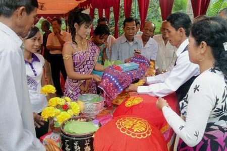 Кхмеры, проживающие в южной части Вьетнама, свадебный проводят свадьбы с января по март по лунному календарю после сбора урожая. Как и многие кхмерские семьи, проживающие в провинциях в дельте реки Меконг, семья кхмера Чау Чан Да в уезде Читон провинции Анзянг провела свадебные обряды для своего сына Чау Лима в соответствии с кхмерскими традициями. Милиционер Чау Лим уже два года встречался с Тхать Тхи Нён – студенткой последнего курса со специализацией в области банковского дела. Они полюбили друг друга и решили вступить в брак. Помолвка была проведена в доме невесты. В список свадебных подарков вошли бетель и плоды пальмы-ареки, разные фрукты и пирожки «Тэт». Кроме того, семья жениха отдала небольшую сумму на покупку одежды для невесты перед её уходом в семью жениха. Под звуки традиционных музыкальных инструментов Фленг Пинпеат прошла торжественная свадебная церемония.