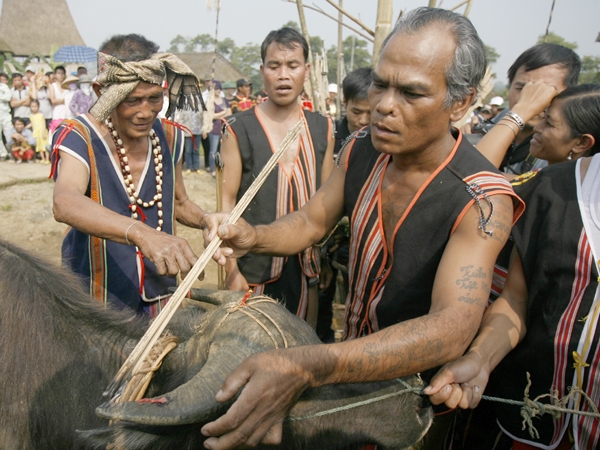 Когда по селению начинают раздаваться звуки гонгов, старейшина селения в качестве главы церемонии зачитает молитву с приглашением Духов принять участие в их празднике и охранять местных жителей. На фоне звуков гонгов и ритма измельчения риса, глава церемонии помазывает кровь животного, использованного для жертвоприношения, на стену нового общинного дома, нового дома или на гонги Тха, кувшины для вина или корзинки для сортовых семян с целью общаться с Духами. Глава церемонии одновременно зачитает молитву о счастливой жизни и большом урожае для местных жителей. Что касается праздников, посвященных сельскохозяйственному производству, то народность Брау верит в то, что Духи земли, воды или риса всегда являются важными Духами, которые решают урожайность посевов. Ежегодно в конце марта и начале апреля, когда начинается дождливый сезон, народность Брау готовится к праздникам нового посева: празднику посева рисовых семян, празднику сбора нового урожая, празднику наполнения склада рисом... с желанием благоприятных погодных условий и большого урожая. Староста селения Дакмэ общины Бо И уезда Нгокхой провинции Контум, господин Тхао Ла сообщил: «Перед входом в новый общинный дом или просто новый дом жители народности Брау часто проводят церемонию жертвоприношения, а именно церемонию убийства буйвола, обрящаясь к Духам земли, гор, воды с просьбой принести благополучие и спокойствие новому дому, а также всему селению и его жителям. А на празднике выращивания риса или маниоки... то мы просим большой урожай риса и маниоки. Мы просим Духов неба и земли нам помочь во всех делах».