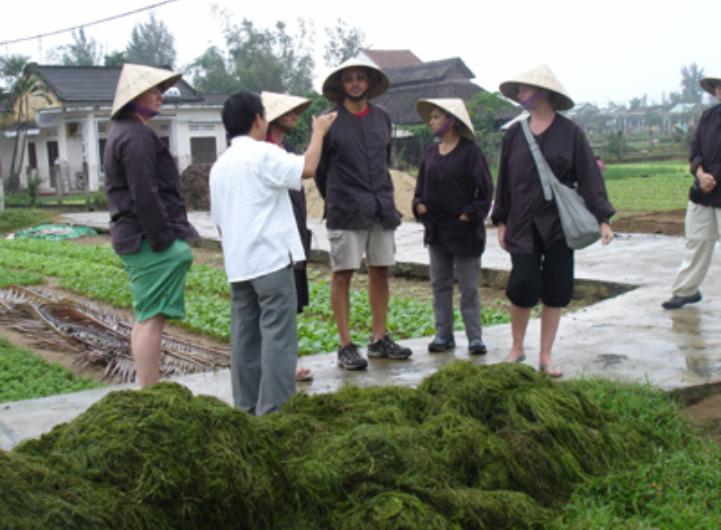 Около 9 часов утра зарубежные туристы переодеваются в традиционные одежды вьетнамских крестьян, на головы одевают вьетнамскую коническую шляпу «нон» и едут на велосипедах по дорогам пригорода Хойан. Затем останавливаются на рисовых чеках, чтобы принять участие в туре «побудь крестьянином и рыбаком один день», предлагаемом международным турагентством Khoa Tran Hoi An Eco Tour. Туристы платят около 20-30 долларов США за этот тур, в ходе которого могут побыть настоящими крестьянами и рыбаками. В начале тура туристам подробно рассказывают гиды – местные жители о всем, что они должны делать. Через 15 минут, все спускаются на поле.