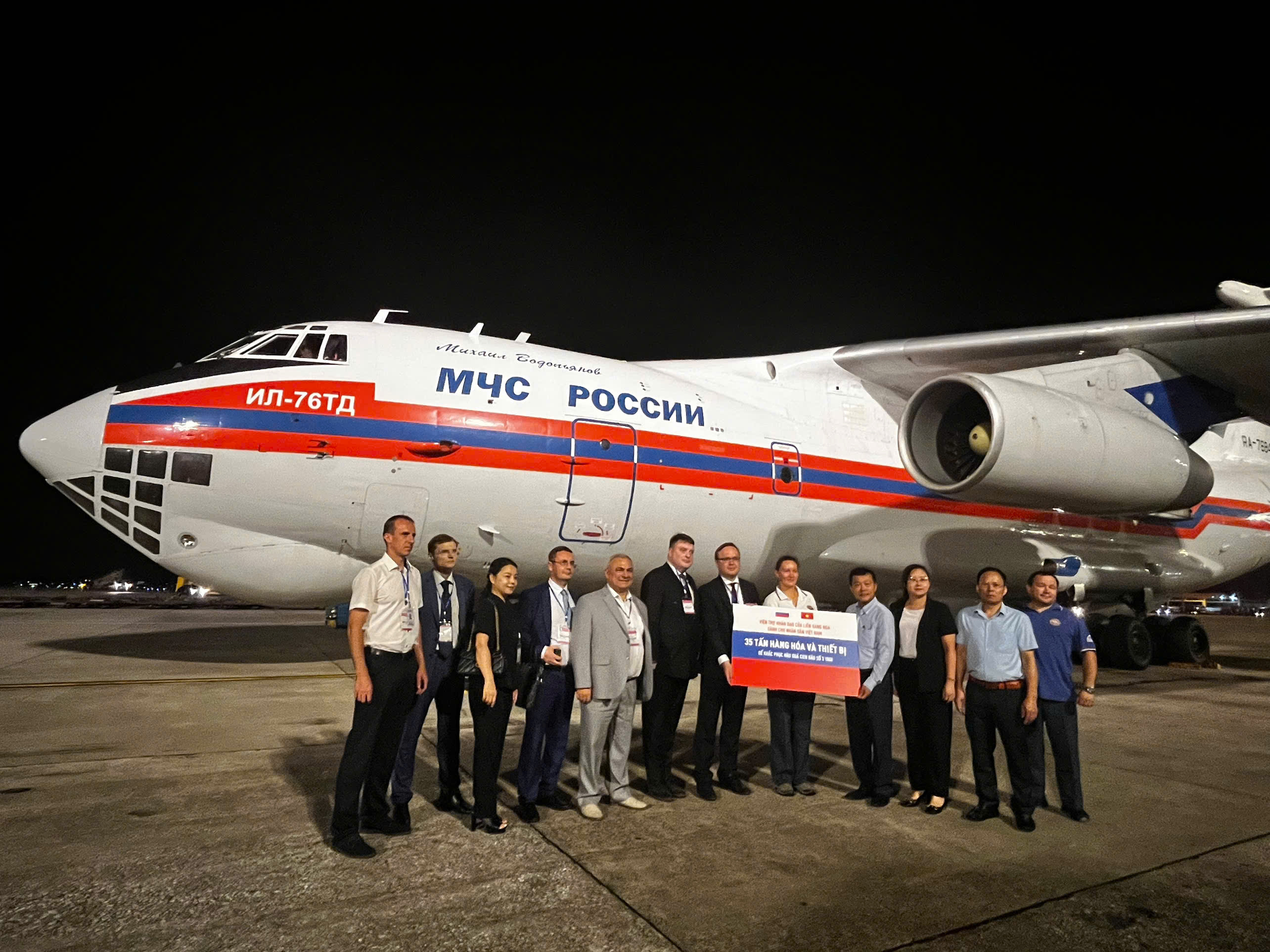 Вечером того же дня в столичном аэропорту «Нойбай» в присутствии заместителя начальника Управления по контролю за дамбами и предотвращению стихийных бедствий Министерства сельского хозяйства и аграрного развития СРВ Нгуен Ван Тиена, Временного поверенного в делах России во Вьетнаме И.С.Нестерова, делегации МЧС России и сотрудников росcийского посольства в Ханое состоялась церемония передачи грузов вьетнамской стороне. Выступая на данном мероприятии, Временный поверенный в делах России во Вьетнаме И.С.Нестеров сказал: «Между нашими странами есть очень хорошая традиция взаимной поддержки в самые тяжелые моменты и периоды, которые были в истории и которые есть сейчас. Сегодня мы присутствуем на церемонии передачи 35 тонн гуманитарной помощи для пострадавших от стихийного бедствия, доставленной специальным бортом МЧС России. Это еще одно проявление традиционно дружественных отношений между народами наших стран, которые продолжаются на протяжении почти 75 лет. Убежден, что оказанная гуманитарная помощь поможет пострадавшим вьетнамским гражданам скорее возвратиться к нормальной жизни».