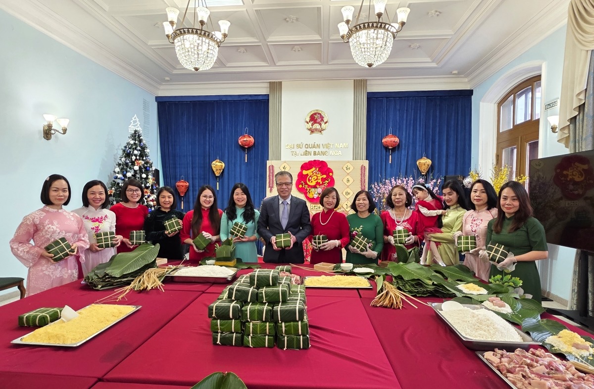 Посол Вьетнама в РФ с сотрудниками участвует в приготовлении баньчынга. Фото: VOV |