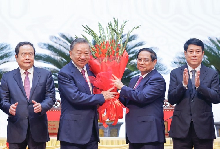 Член Политбюро, Премьер-министр Фам Минь Тинь от имени ключевых руководителей, высокопоставленных руководителей Партии и Государства вручает цветы товарищу То Ламу по случаю его избрания на должность Генерального секретаря ЦК КПВ. Фото: VGP |