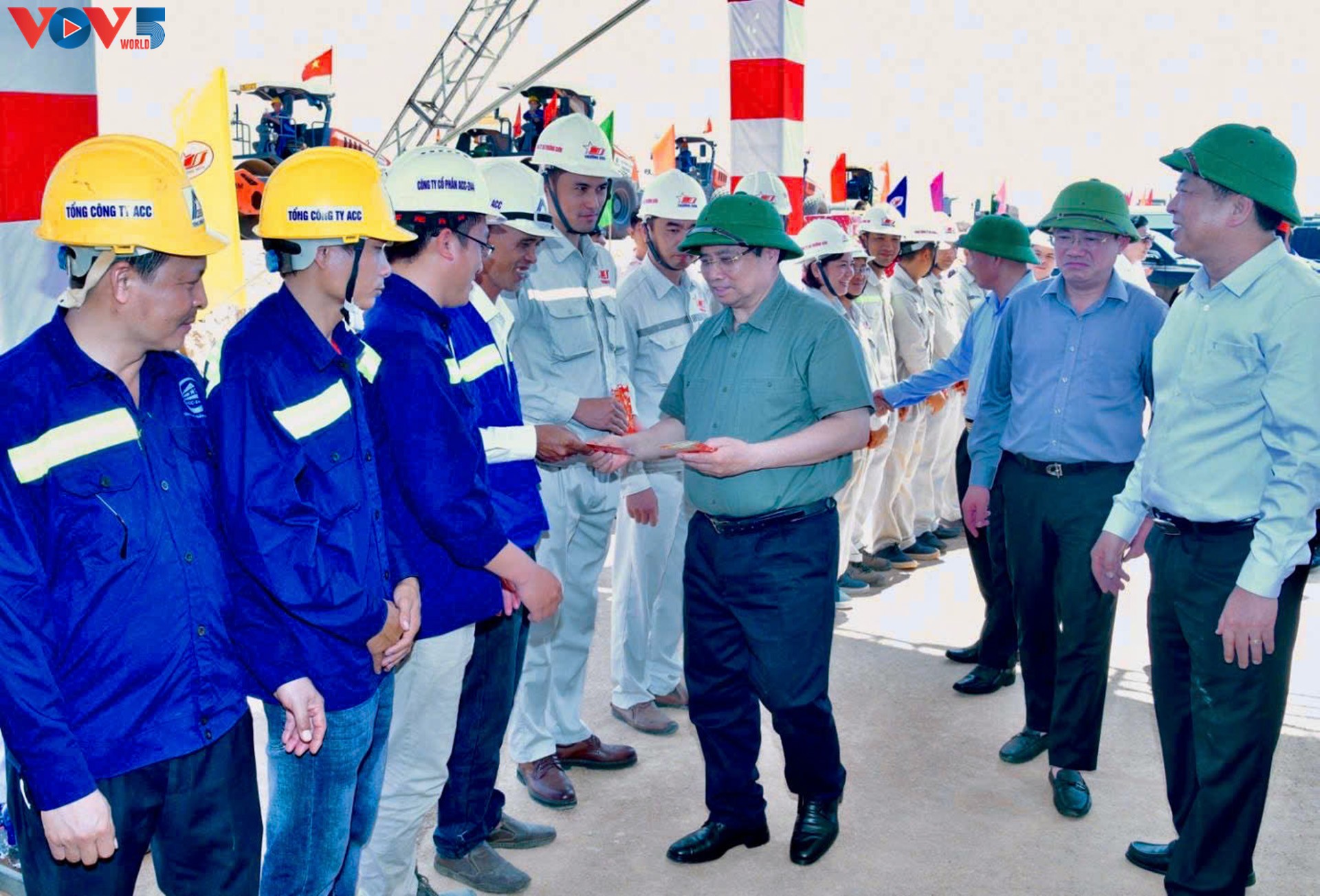 Премьер-министр Фам Минь Тинь вручает строителям красные конвертики с деньгами на удачу. |
