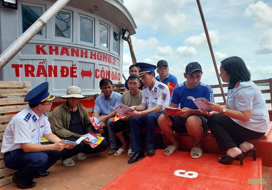 Военнослужащие 4-го военно-морского округа распространяют законы для повышения осведомленности судовладельцев, капитанов и рыбаков о борьбе с ННН-промыслом. Фото: qdnd.vn |