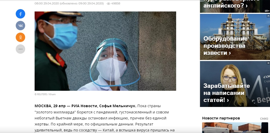 29 апреля РИА Новости опубликовало статью, в которой говорится о ситуации с эпидемией COVID-19 во Вьетнаме.