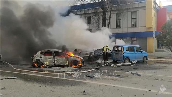 Горящие автомобили после нападения в российском городе Белгороде, расположенном примерно в 40 км от границы с Украиной, 30 декабря 2023 года. Фото: AFP/ VNА |