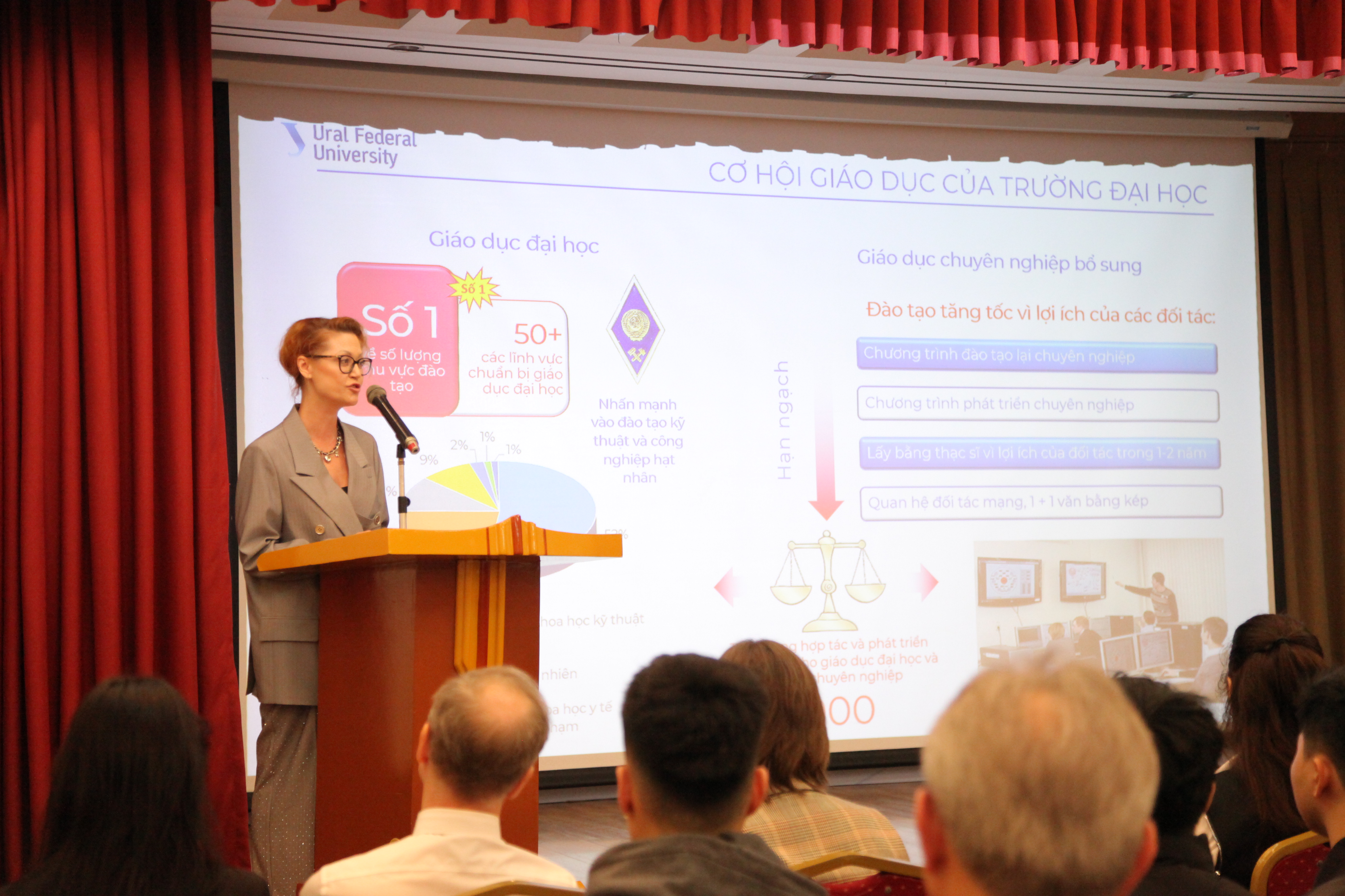 Наталья Андрейченко, проректор по развитию магистратуры УрФУ заявила: «Предприятие – это очень тесная связка с партнерами, поэтому задача нас, как представителей университета, не просто поговорить со школьниками, представить им возможности университета, а ключевая задача – это найти партнеров, для которых мы будем готовить вьетнамских студентов, и передавать их обратно в целях развития вот тех направлений, которые для вас являются приоритетными. И вот сейчас у нас очень сильно развивается система, когда студенты учатся, а дальше мы, например, с «Росатомом» создаем программу дополнительного профессионального образования, и студенты параллельно учатся, но в интересах уже вот этого конкретного партнера. Сейчас предприятия очень заинтересованы в том, чтобы максимально быстро встраивать людей, но при этом и давать им возможность учиться».
