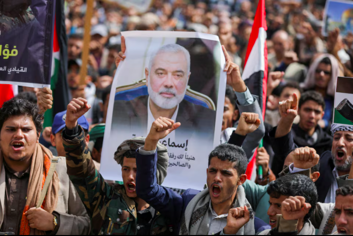Протестующие держали плакат с изображением убитого лидера ХАМАС Исмаила Хании во время демонстрации возле офиса ООН в Йемене 3 августа. Фото: Рейтер |