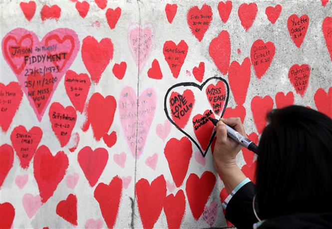 Пишуют сообщение на стене в память о погибших от COVID-19 в Лондоне.