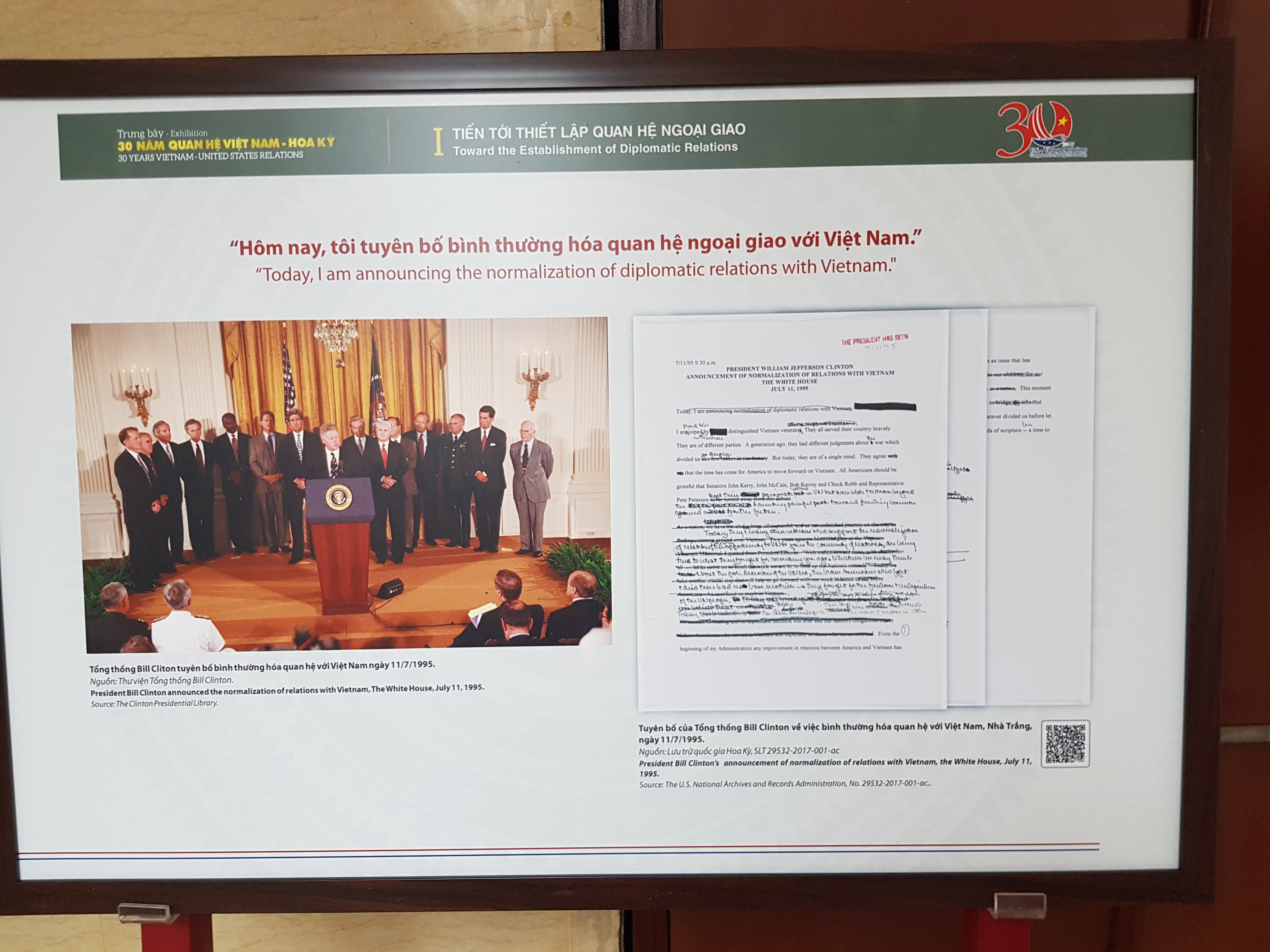 Экспозиция включает три раздела: Раздел I: К установлению дипломатических отношений, Раздел II: Сотрудничество и развитие, Раздел III: Уверенный шаг в новую эпоху. По случаю выставки Посольство США во Вьетнаме также передало в дар 30 фотографий — символизирующих 30 лет с момента установления дипломатических отношений между двумя странами.
