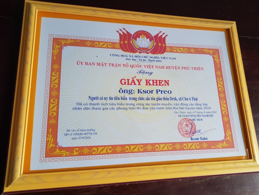 Ксор Прео 1948 года рождения является зампредседателя Общества пожилых людей общины Тьыатхай, главой отделения Южной Протестантской церкви Вьетнама в деревне Дрок. Он всегда призывает верующих любить свою страну, жить с Богом, и вносить вклад в развитие своей родной земли. Ксор Прео говорит: «Партия и односельчане оказали мне доверие, назвав меня влиятельным человеком в деревне. Влиятельный человек должен показать пример в трех местах: в семье, обществе и государстве. Моя главная задача – призывать людей соблюдать политику Партии и законодательство страны, не поддаться попыткам тихой дестабилизации».