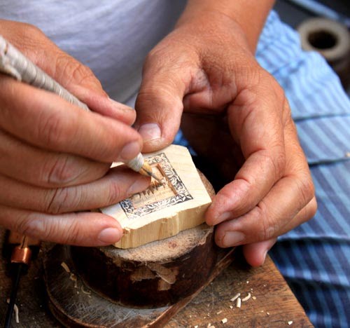 Деревяные печати с гравюрами являются одним из видов продукции самобытных художественных промыслов Ханоя. Никто не помнит, когда появился этот промысел в Ханое, но когда-то он был известен на улице Тотить, что находится в самом центре нашей столицы.. Однако, в условиях урбанизации многие семьи, проживающие на этой улице изменили сферу бизнеса. Здесь осталось только несколько магазинов на улицах, таких как «Хангкуат», «Хангбонг», «Хангбак» и «Тахиен», в которых занимаются гравировкой по дереву на заказ. А магазин гравировщика Чинь Суан Лыка находится в скромном доме 22 на «серебряной» улице «Хангбак». На стене висят 2 доски с образцами деревянных печатей, на полу стоит коробка с гравировальными инструментами, несколько пластмассовых стульчиков. Своим робким голосом Чинь Суан Лык сказал, что он родом из провинции Тханьхоа и его дедушка и бабушка по матери занимались гравировкой печатей в древнем квартале Ханоя уже много лет назад. Однако он решил заниматься этой работой совсем случайно: «Сначала я не думал, что буду заниматься этой работой. Однажды я побывал в гостях у дяди по матери, проживающего на ханойской улице Хангкуат и увидел, как он занимался гравировкой по дереву. Я увлекся этой работой и попросил дядю научить меня. Работа оказалась совсем не простой. Сначала я должен был научиться точить ножи, ведь гравировка по дереву требует острых ножей.»