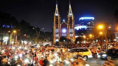 В эти дни на улицах южновьетнамского города Хошимине царит рождественская атмосфера. Многоэтажные здания, большие торговые центры и магазины украшены искусственными елками и елочными гирляндами. Повсюду видны красненькие колпачки с белым мехом Санта-Клаусов и Дедов Морозов. Все с радостью встречают Рождество, которое стало общим праздником католиков и жителей всей страны.