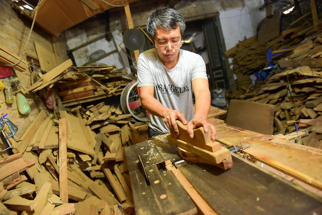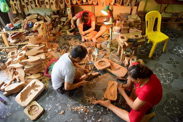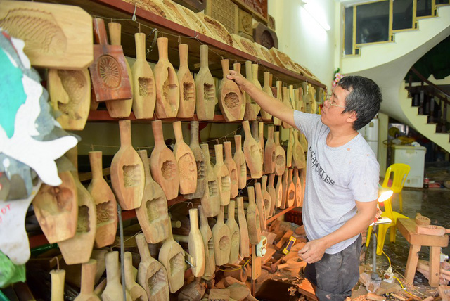 Говорят, что лучшие формы для лунных пирогов должны быть сделаны из древесины хурмы десятитычинковой или кайи сенегальской. Эти виды древесины отличаются долговечностью, гладкостью и легко обрабатываются. Для проверки качества древесины мастер должен придавить глину (в качестве имитации пирожка) в формочке. Чан Ван Бан далее рассказывает: «Раньше мы делали формы вручную, а теперь - с помощью машин и различных оборудований. Самая важная стадия изготовления форм – это украсить форму узорами. Этот шаг мы делаем вручную. Есть отдельные формы для «бань-ныонг» и «бань-зео». Форма лотоса является традиционной для приготовления «бань-зео», а для выпечки «бань-ныонг» обычно выбирают форму с узорами смешанных цветов. Если мы следуем правильной технике изготовления, то форма получится равной и красивой».