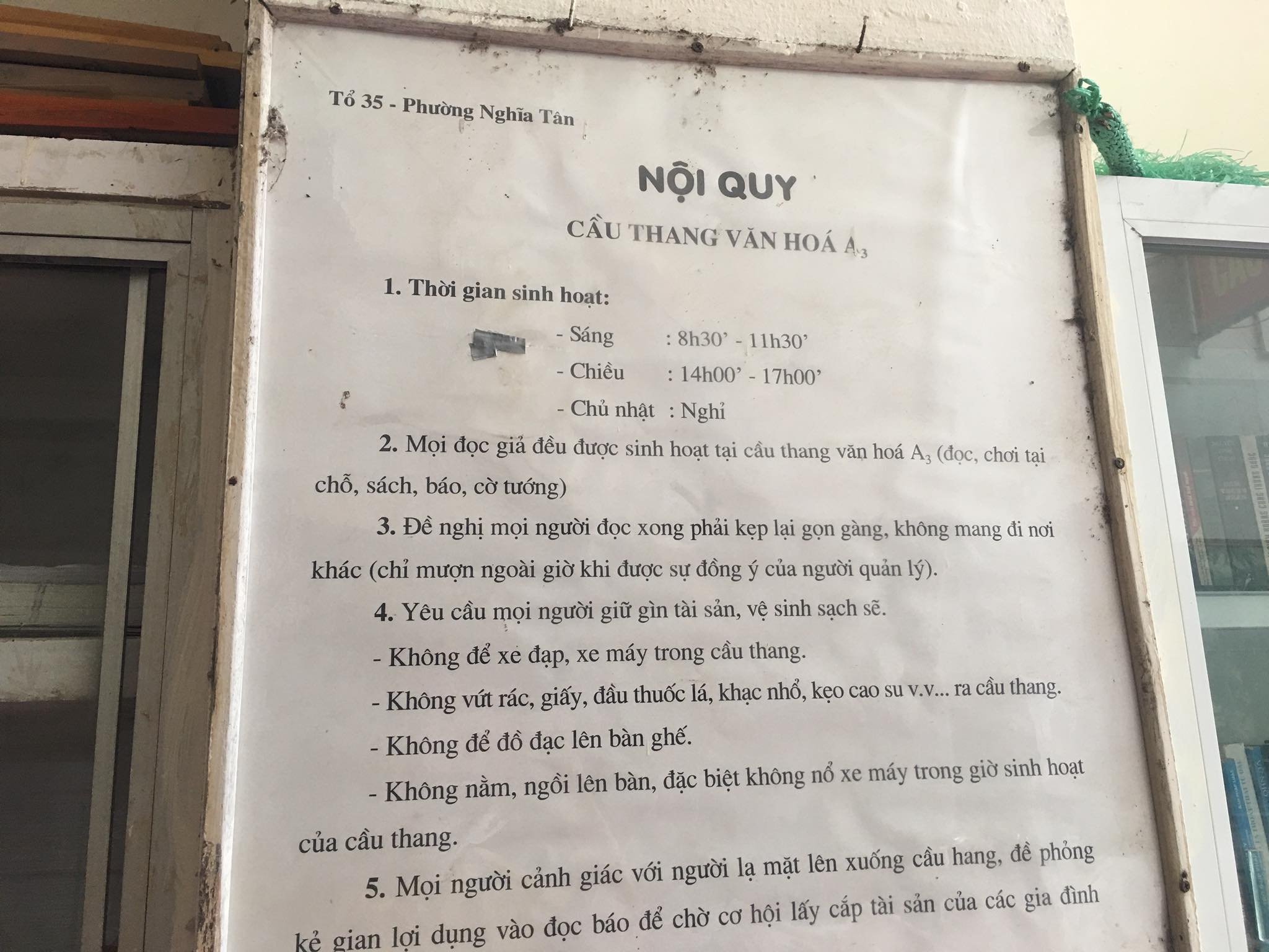 В настоящее время, несмотря на бурное развитие информационных технологий, жители дома А3, особенно пожилые, сохраняют читательскую культуру. Каждый день мини-библиотеку посещают примерно 20 человек. Управляющий «лестницей культуры» До Чунг Минь поделился своими впечатлениями: В нашей мини-библиотеке имеются 18-20 наименований газет и журналов, которые обновляются ежедневно. Мини-библиотеки были основаны и в домах А5, А6. Многие места переняли наш опыт в этом.