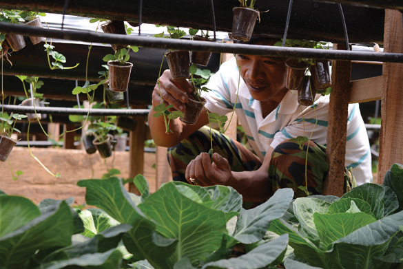 | Нгуен Тхань Чунг ухаживает за своим земляничным садом |