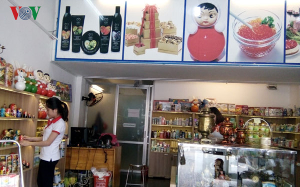 Затем мы пошли в магазин «Russia Shop», находящийся на улице Во Ван Тан в 5-м квартале 3-го района. Он является знакомым для российских туристов местом в городе Хошимин. В магазине, имеющем небольшую площадь, продаются разнообразные виды товаров российского производства такие как: матрешки, неваляшки и другие сувениры, продукты (копченый сыр, паштет из гусиной печени марки «Hame», черный хлеб), а также функциональные продукты питания (травяной чай, черный чай, чай из чаги, кедровое масло натура Сиберика). Как отметила Ле Тхи Тху Хыонг – директор магазина. Эта торговая точка специально предназначенна для продажи товаров российского производства, поэтому пользуется популярностью среди россиянин в городе Хошимине. Далее Ле Тхи Тху Хыонг сказала: «Наши постоянные клиенты отдают предпочтение знакомым им продуктам питания. Это, например, соусы для салатов, консервированное мясо, шоколад».
