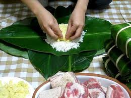 В преддверии новогоднего праздника по лунному календарю мы поехали вдоль речной дамбы Красной реки в деревню традиционного промысла по приготовлению рисовых пирогов Чанькхук. Вместе с нами по узкой деревенской дороге ехали грузовики с марантовыми листьями. По словам местных стариков, никто не знает, когда образовалась эта деревня, но с самого рождения все люди начинают привыкать к марантовым листьям, клейкому рису, свинине и золотистому гороху – ингредиентам новогоднего пирога. Все семьи в деревне Чанькхук в среднем выпускают на рынок примерно 200 рисовых пирогов в день. Однако с 23 декабря по лунному календарю, то есть за неделю до вьетнамского традиционного нового года, количество приготовленных за 1 день пирогов может повыситься до 10 раз. Чтобы пирог получился мягким и вкусным, повара обязательно должны выбрать лучшие ингредиенты. Это иногда даже считается семейной тайной. Владелец заведения «Чанг Тханг», господин Нгуен Зуи Тханг сказал: «Нужно уделять особое внимание выбору ингредиентов. Свинина, клейкий рис, золотистый горох и марантовый лист – это главные ингредиенты рисового пирога. Я часто выбираю клейкий рис уезда Хайхау, а мясо должно быть на половину жирный. Лучше всего брать грудинку, так как окорок делает пирог сухим. Для заворачивания пирогов я люблю использовать хорошо помытые лесные марантовые листья».