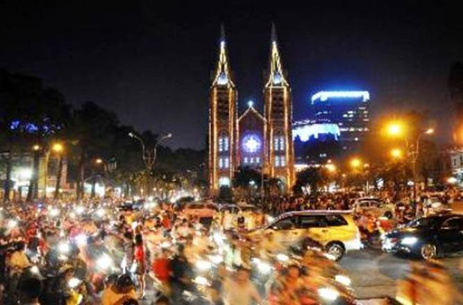 В эти дни на улицах южновьетнамского города Хошимине царит рождественская атмосфера. Многоэтажные здания, большие торговые центры и магазины украшены искусственными елками и елочными гирляндами. Повсюду видны красненькие колпачки с белым мехом Санта-Клаусов и Дедов Морозов. Все с радостью встречают Рождество, которое стало общим праздником католиков и жителей всей страны.