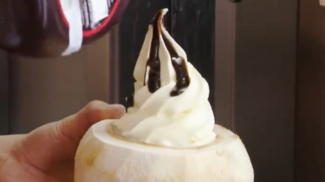 (VOVWORLD) - Здесь продают кокос с большим количеством мороженого. Одного кокоса с мороженым хватает на двоих. В мороженое добавляют кокосовые волокна, поэтому оно очень вкусное и не слишком сладкое.