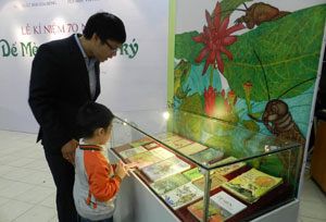| A man and his son look in an exhibit marking Adventures of a Cricket’s 70th birthday. Photo by Minh Thu/VNNews |