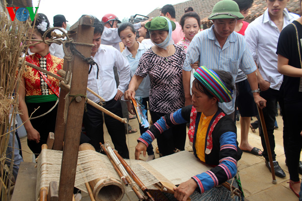 In the Son La area, Thai girls in colorful traditional costumes are showing visitors the ball which is used in a game called ‘Nem con’, which involves throwing a ball through a ring. The game is often played at Spring festivals. Muong ethnic people have attracted younger visitors with their hand-made dolls, bags, and brocade wallets. Cao Lan people from Bac Giang who are participating in this year’s market-day for the first time have traditionally patterned brocade products to show to visitors. Duong Van Quang, a Cao Lan man from Luc Nam district, Bac Giang, says: “the Vietnam Ethnic Groups Cultural Day has helped us introduce our traditional products to other ethnic groups in the country. This also offers us a chance to restore our traditional textile industry and the craft of ’Giay do’, handmade paper.”