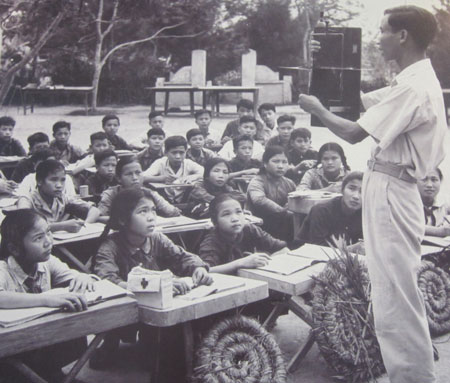 Nguyen Cong Hung talked to his 8-year-old son about the photos that portray the hardships that children had to experience during the war. The boy gazed passionately at the photos of pupils studying or a mother taking a child to school. Hung hopes that in time his son will understand this period and make the most of his life. Hung himself feels moved at the photos that depict the children who tried to go to school throughout the bombing campaign. The photo of the first school day, by the bomb shelters, when the pupils wore straw hats and walked barefoot to the opening ceremony of the new academic year is still inspiring. The powerful picture of two kids in front of an A-shaped bomb shelter smiling despite the suffering caused by the war all around them, gives visitors the impression that the war didn’t happen there. Nguyen Cong Hung says ‘I come about this exhibition by chance and brought my son here in the hope that he will understand how hard life had been for his parents and therefore make the most of his life. I’m very impressed by the photo of the children who were doing their lessons by the A-shaped bomb shelter. They simply didn’t think about the war they just paid attention to their studies.’